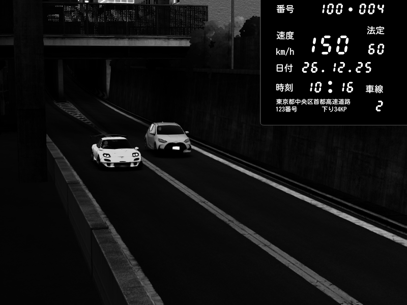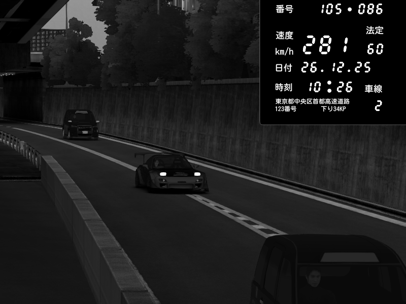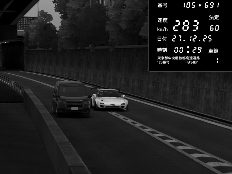 | 2025/12/27 00:29 | C1外回り 京橋 | 283 / 60 km/h | 狙撃されたセイキン | Mazda RX-7 FD3S FEED Afflux GT3 | CAPTURE |
