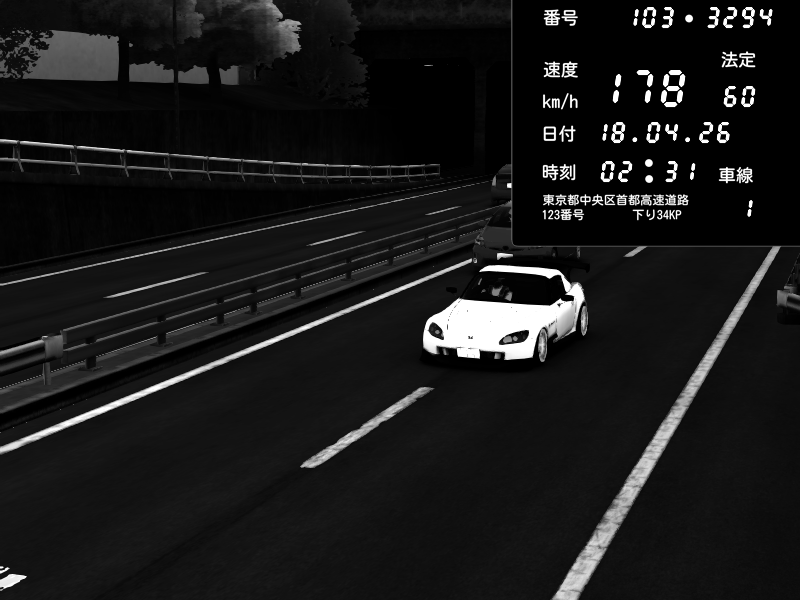 | 2026/04/18 02:31 | C1内回り 銀座 | 178 / 60 km/h | 木曜が一番疲れている | Honda S2000 (AP2 - Legendary) | CAPTURE |