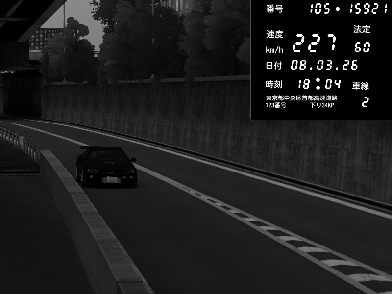 | 2026/03/08 18:06 | C1外回り 新富町 | 195 / 60 km/h | Kurokabe | Nissan Skyline GTR R33 (S3 - Wangan) | CAPTURE |