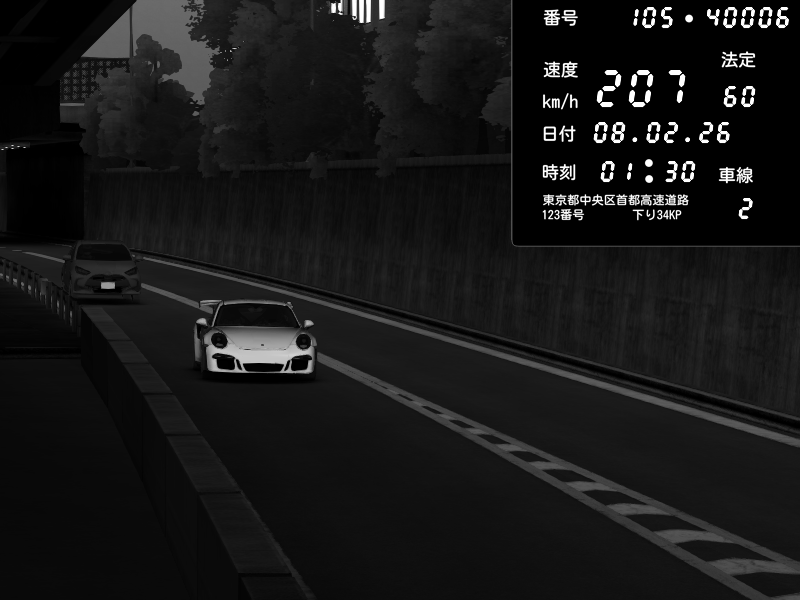| 2026/02/08 01:31 | C1外回り 京橋 | 207 / 60 km/h | hi_im_noob | Porsche 911 GT3 RS | CAPTURE |