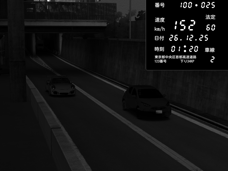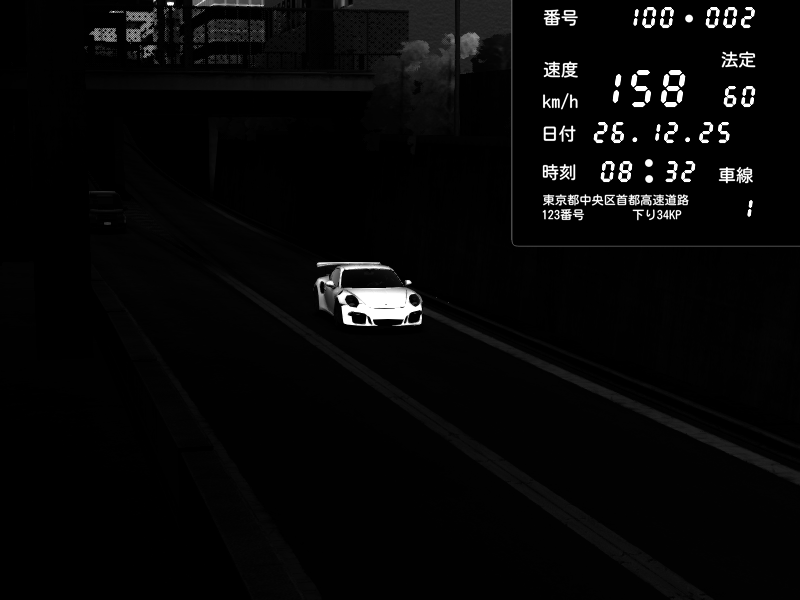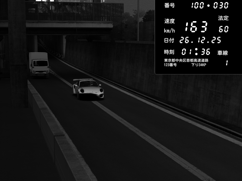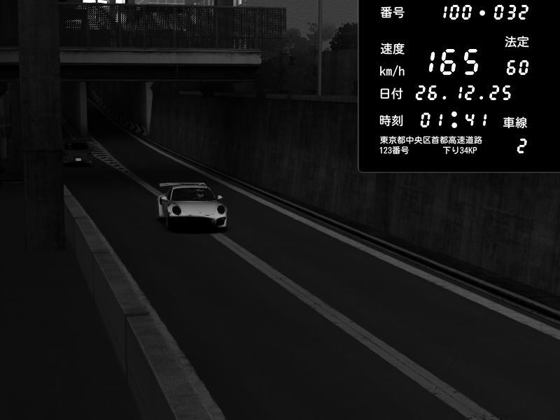 | 2025/12/26 01:26 | C1内回り 京橋 | 150 / 60 km/h | taiyaki | Porsche 911 GT3 RS | CAPTURE |