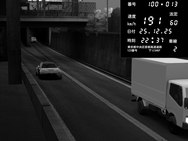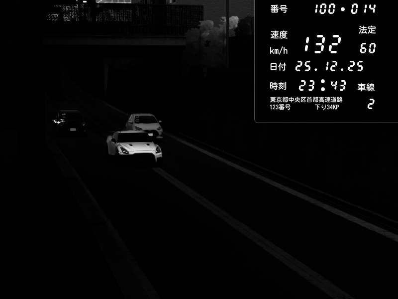 | 2025/12/25 23:43 | C1内回り 京橋 | 132 / 60 km/h | ナガえもん | Nissan GT-R NISMO 2017 | CAPTURE |