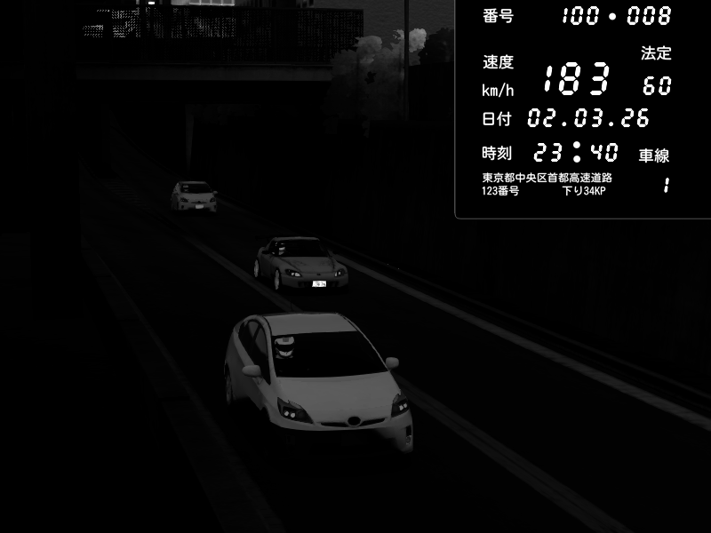| 2026/03/02 23:40 | C1内回り 京橋 | 183 / 60 km/h | 木曜が一番疲れている | Honda S2000 (AP2 - Legendary) | CAPTURE |