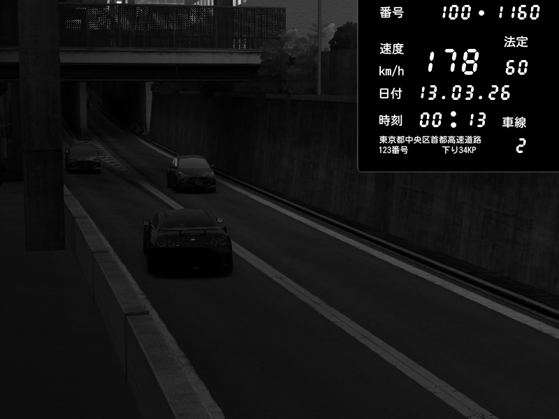 | 2026/03/11 01:24 | C1内回り 京橋 | 142 / 60 km/h | LittleClimb | Nissan GT-R NISMO 2017 | CAPTURE |