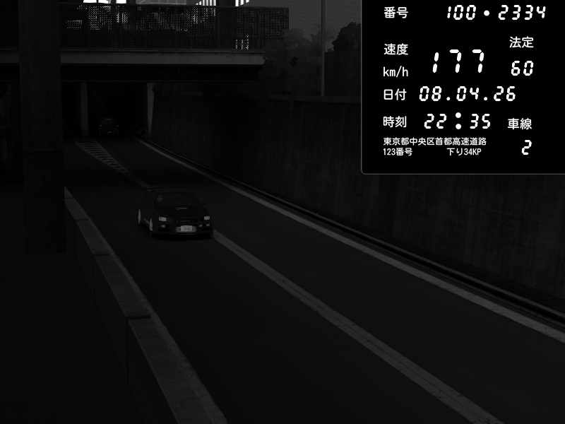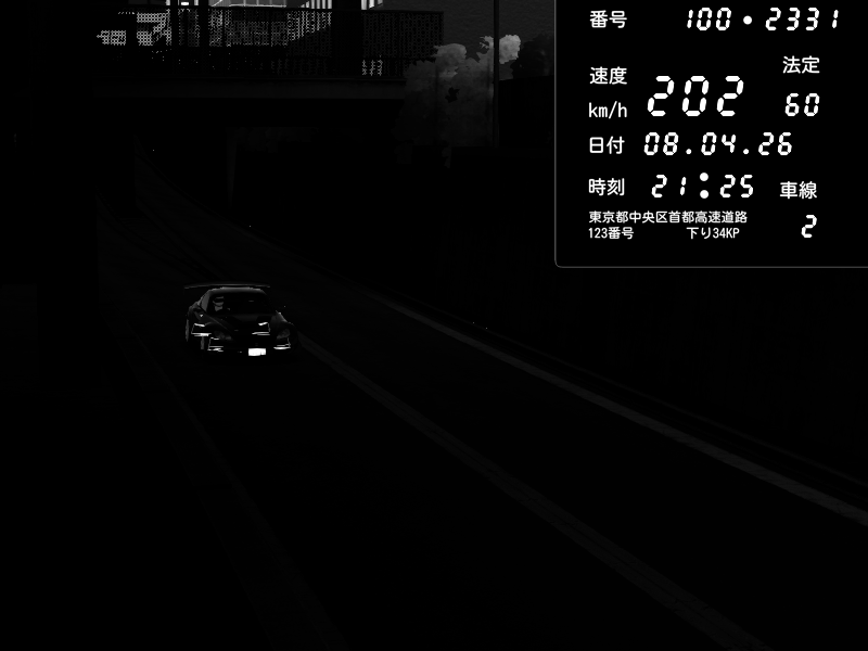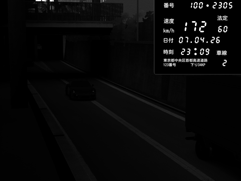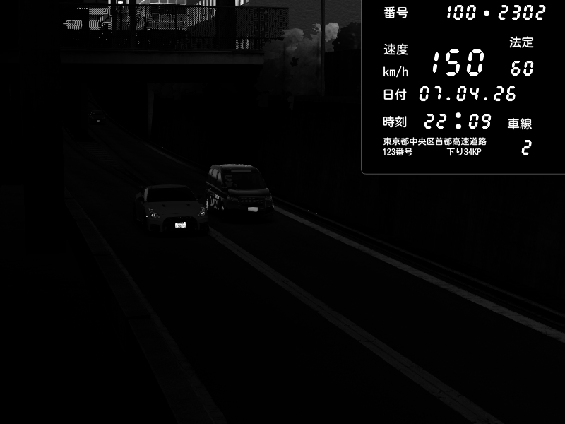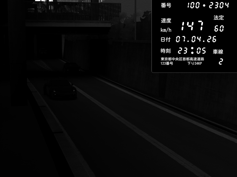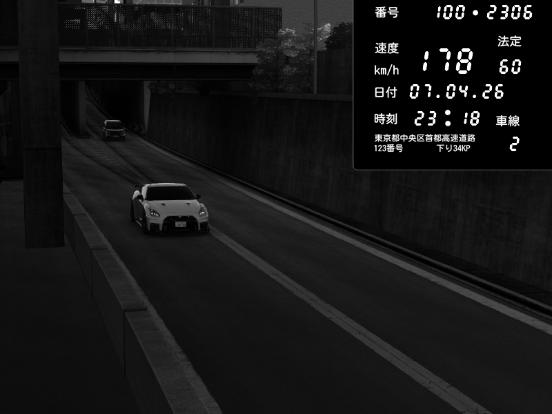 | 2026/04/07 23:18 | C1内回り 京橋 | 178 / 60 km/h | Zane | Nissan GT-R NISMO 2017 | CAPTURE |