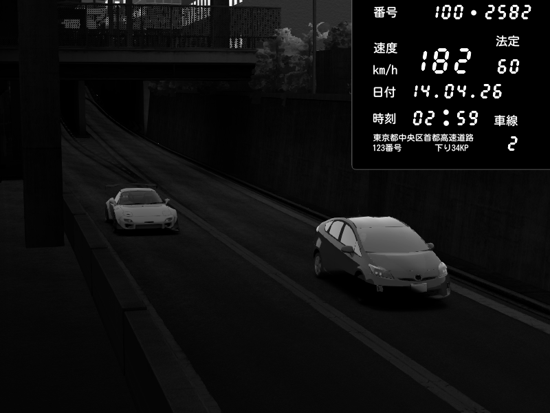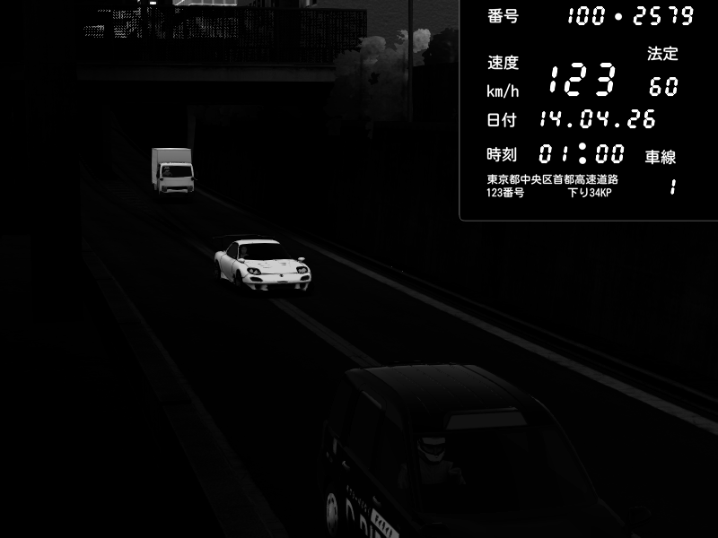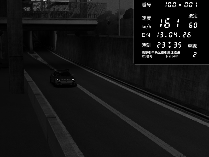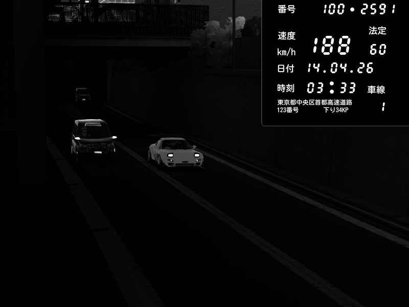 | 2026/04/13 23:15 | C1内回り 京橋 | 146 / 60 km/h | Player | Mazda RX-7 FD3S RE Amemiya | CAPTURE |