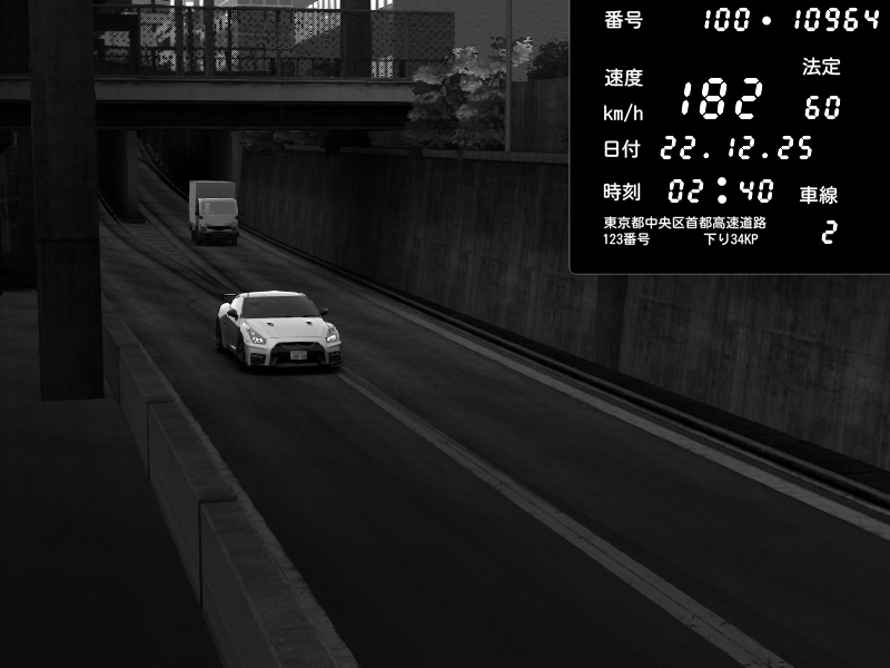 | 2025/12/22 02:40 | C1内回り 京橋 | 182 / 60 km/h | kenitilou | Nissan GT-R NISMO 2017 | CAPTURE |