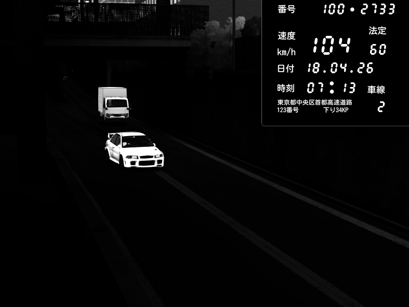 | 2026/04/17 22:00 | C1内回り 京橋 | 143 / 60 km/h | Solotov | Mitsubishi Lancer Evolution V Wangan Spec | CAPTURE |