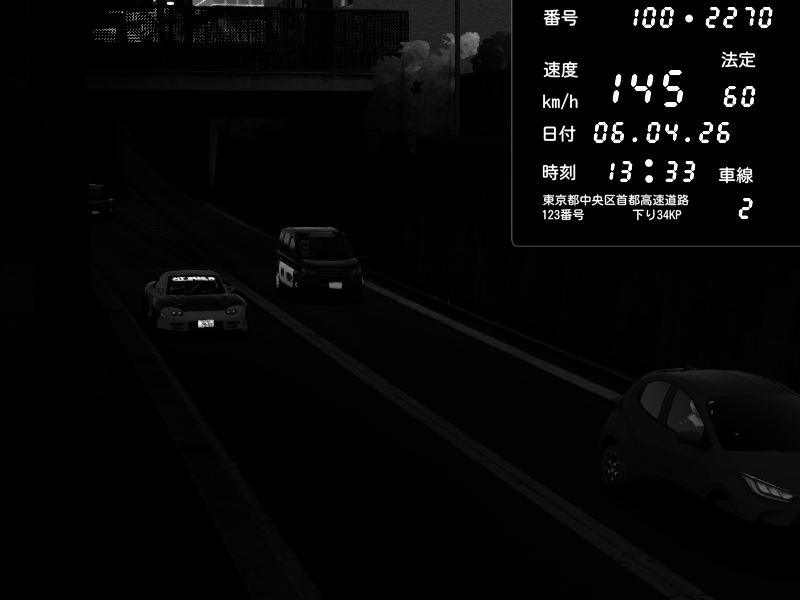 | 2026/04/06 13:33 | C1内回り 京橋 | 145 / 60 km/h | Player | Pit Road M - Mitsubishi GTO Twin Turbo | CAPTURE |