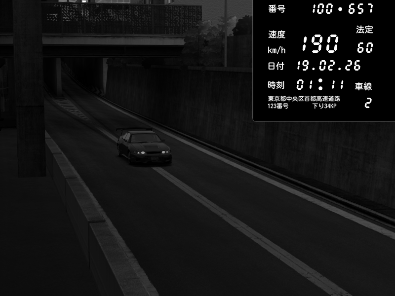 | 2026/02/19 01:11 | C1内回り 京橋 | 190 / 60 km/h | gc8 lover | Nissan Skyline GTR R33 (S3 - Wangan) | CAPTURE |