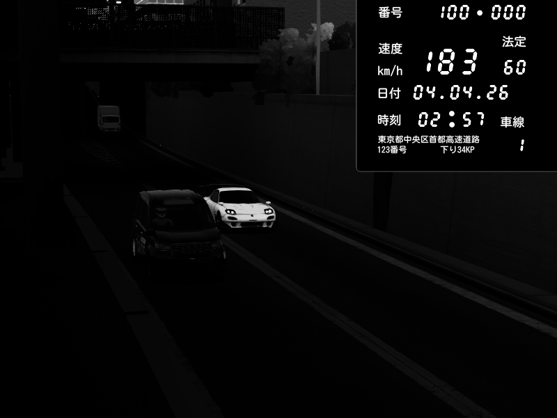 | 2026/04/04 02:58 | C1内回り 京橋 | 183 / 60 km/h | Player | Mazda RX-7 FD3S RE Amemiya | CAPTURE |