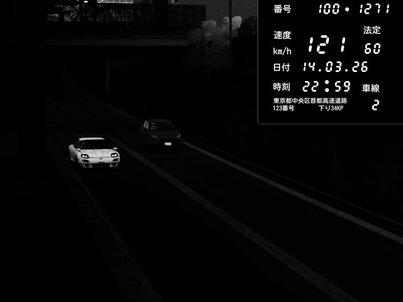 | 2026/03/14 22:59 | C1内回り 京橋 | 121 / 60 km/h | LEVEL3080 | Mazda RX-7 FD3S RE Amemiya | CAPTURE |