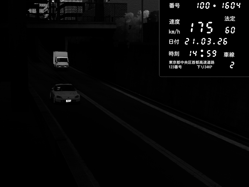 | 2026/03/21 14:59 | C1内回り 京橋 | 175 / 60 km/h | YF13 | Honda S2000 (AP2 - Legendary) | CAPTURE |