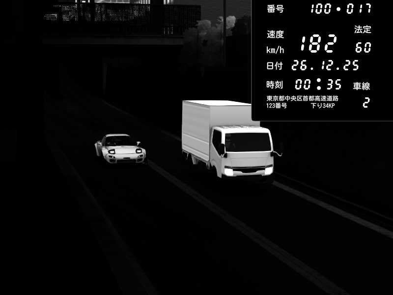 | 2025/12/25 15:11 | C1内回り 京橋 | 127 / 60 km/h | Player | Mazda RX-7 FD3S FEED Afflux GT3 | CAPTURE |