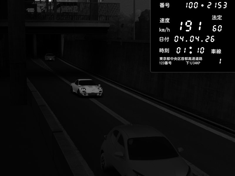 | 2026/04/04 01:10 | C1内回り 京橋 | 191 / 60 km/h | INoob | Mazda RX-7 FD3S RE Amemiya | CAPTURE |