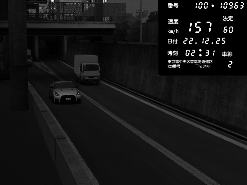 | 2025/12/21 00:15 | C1内回り 京橋 | 154 / 60 km/h | Player | Nissan GT-R NISMO 2017 | CAPTURE |