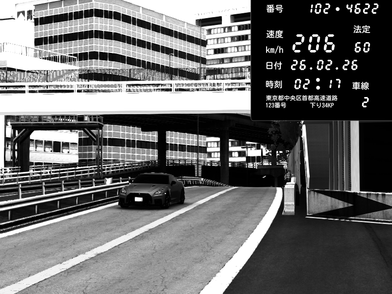 | 2026/02/26 02:17 | C1外回り 新富町 | 206 / 60 km/h | Shutoko Queen | Nissan GT-R NISMO 2017 | CAPTURE |