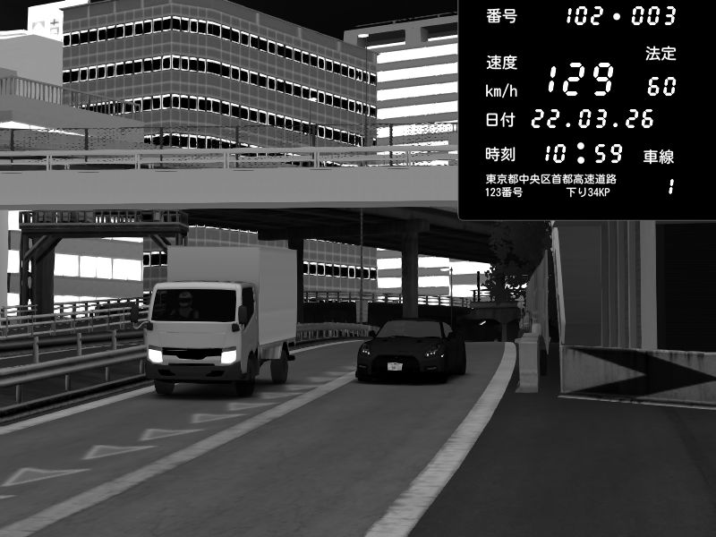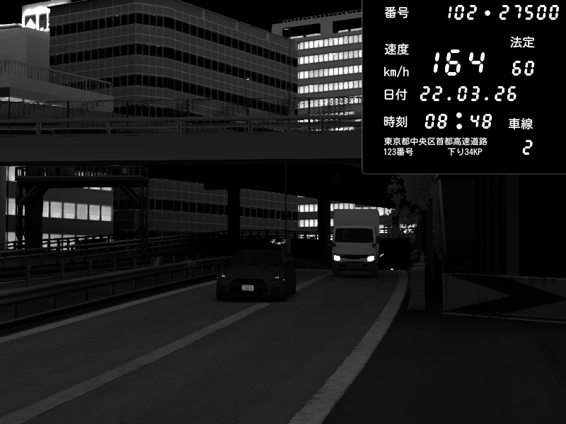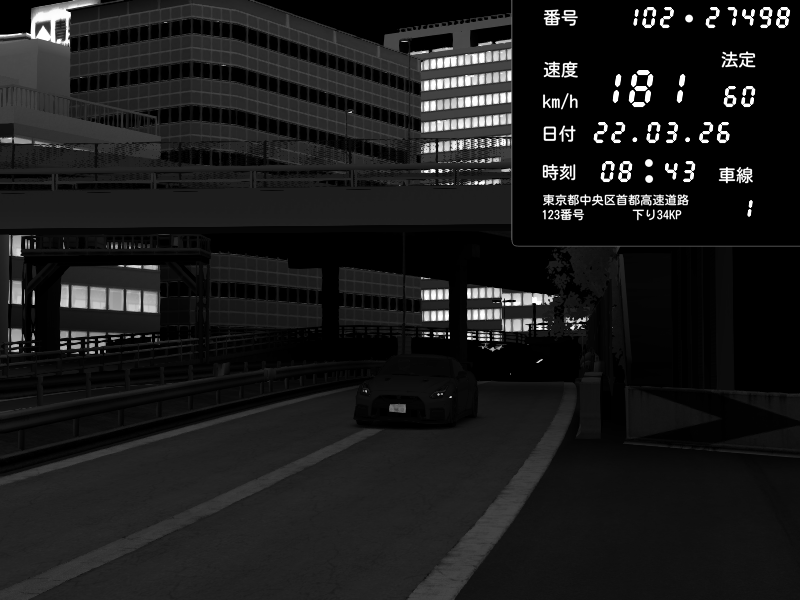 | 2026/03/22 08:43 | C1外回り 新富町 | 181 / 60 km/h | クロちゃん | Nissan GT-R NISMO 2017 | CAPTURE |