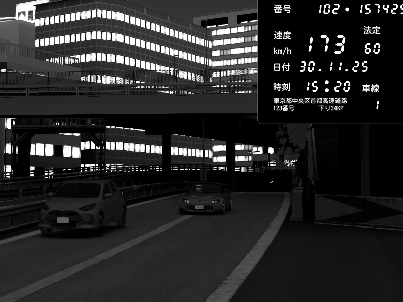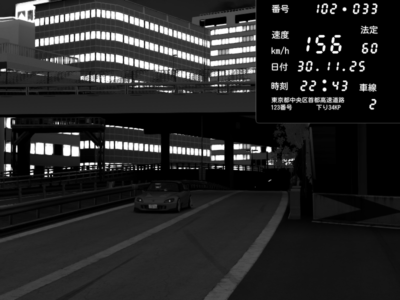 | 2025/11/30 22:46 | C1外回り 新富町 | 182 / 60 km/h | yukito(pad) | Honda S2000 (AP2 - Legendary) | CAPTURE |