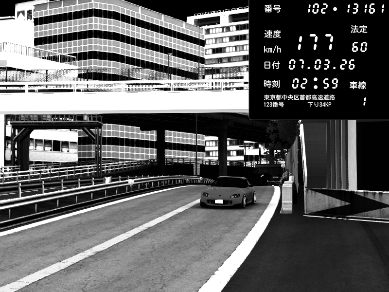 | 2026/03/07 23:16 | C1外回り 新富町 | 187 / 60 km/h | Player | Honda S2000 (AP2 - Legendary) | CAPTURE |