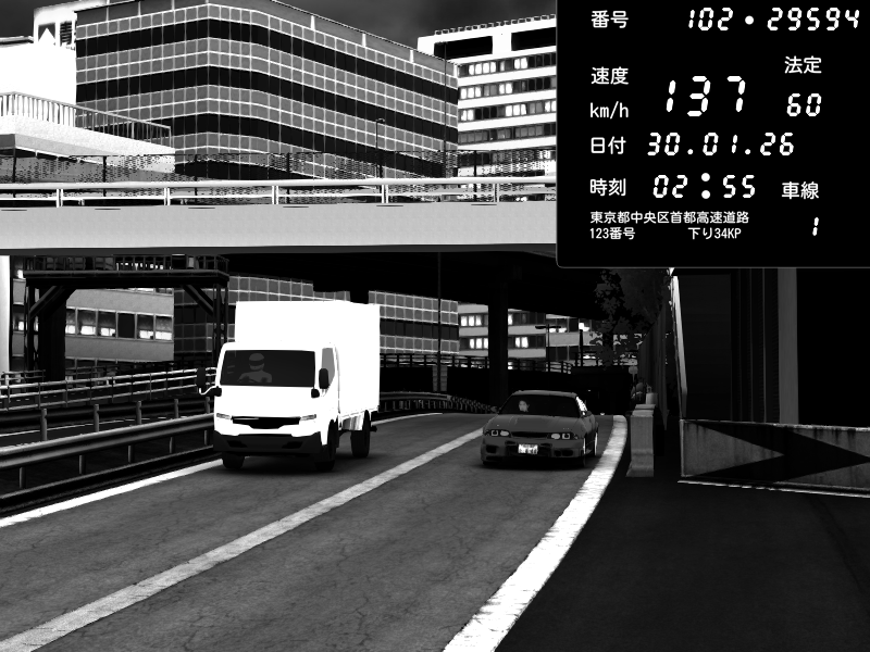 | 2026/01/30 02:55 | C1外回り 新富町 | 137 / 60 km/h | SHOW5 | Nissan Skyline GTR R33 (S3 - Wangan) | CAPTURE |