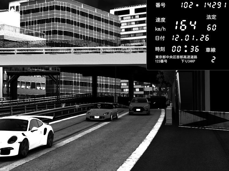 | 2026/01/12 00:40 | C1外回り 新富町 | 176 / 60 km/h | Sugamo | Porsche 911 GT3 RS | CAPTURE |