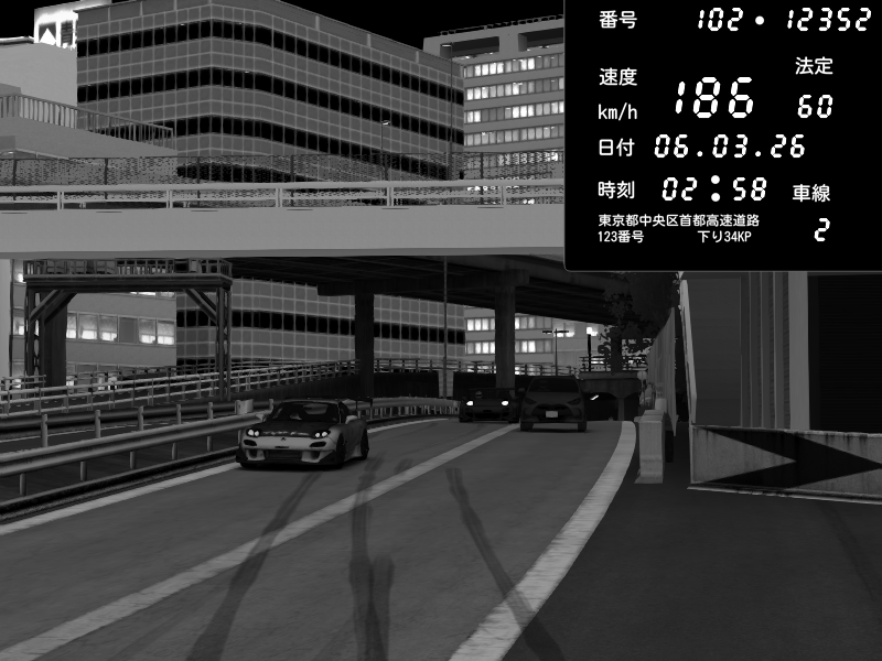 | 2026/03/07 04:00 | C1外回り 新富町 | 186 / 60 km/h | GUGUREKASU | Pit Road M - Mitsubishi GTO Twin Turbo | CAPTURE |