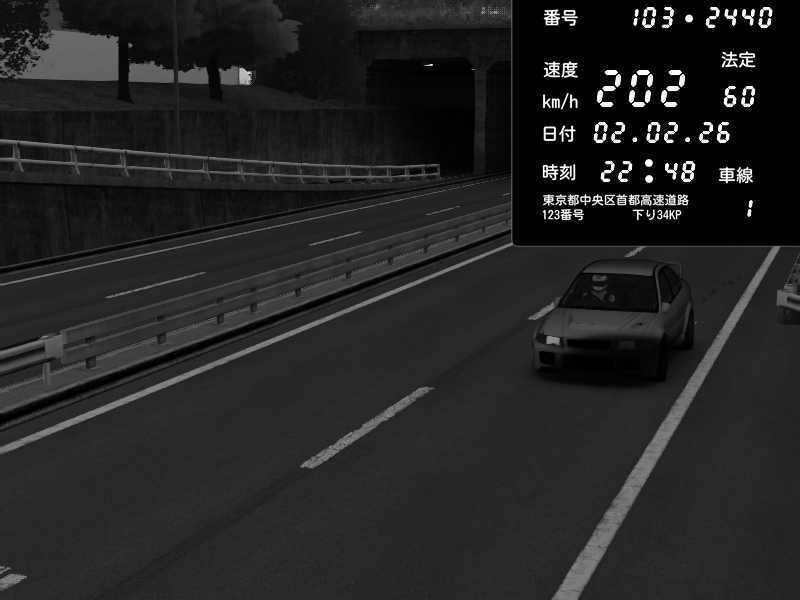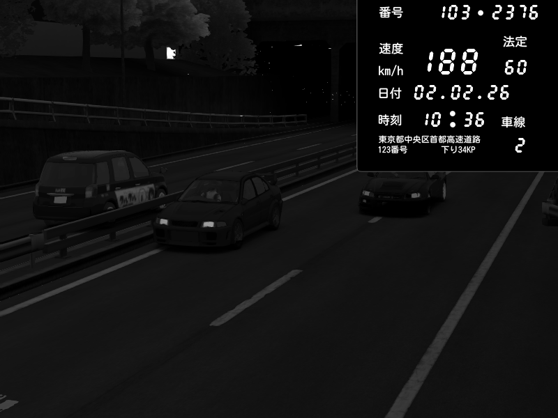 | 2026/02/02 22:48 | C1内回り 銀座 | 202 / 60 km/h | bib | Mitsubishi Lancer Evolution V Wangan Spec | CAPTURE |
