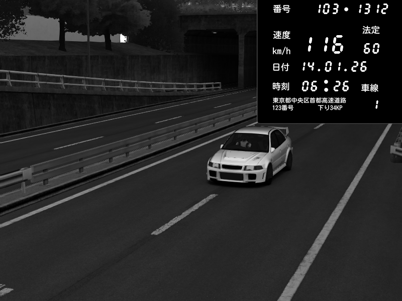 | 2026/01/14 06:38 | C1内回り 銀座 | 145 / 60 km/h | Santos | Mitsubishi Lancer Evolution V Wangan Spec | CAPTURE |