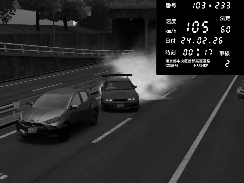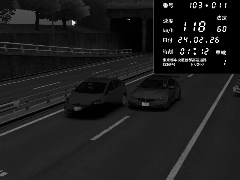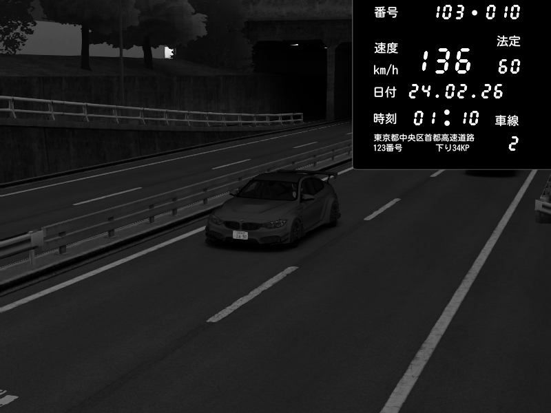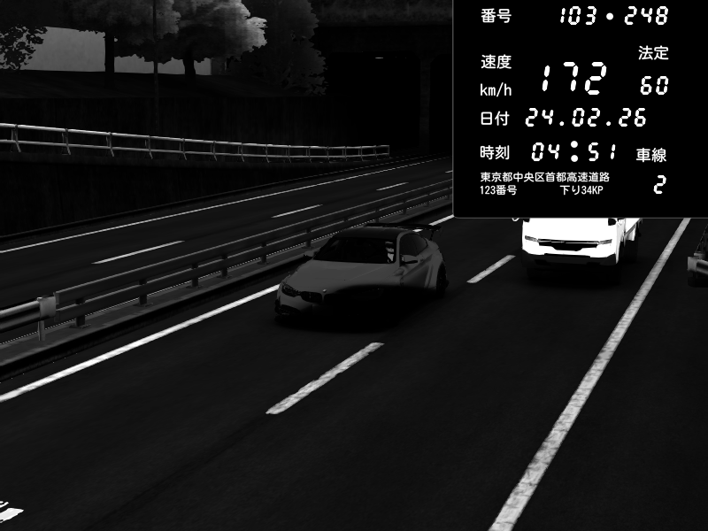 | 2026/02/24 04:51 | C1内回り 銀座 | 172 / 60 km/h | BabyBigJoke | BMW M4 crash.Sp Varis Widebody | CAPTURE |