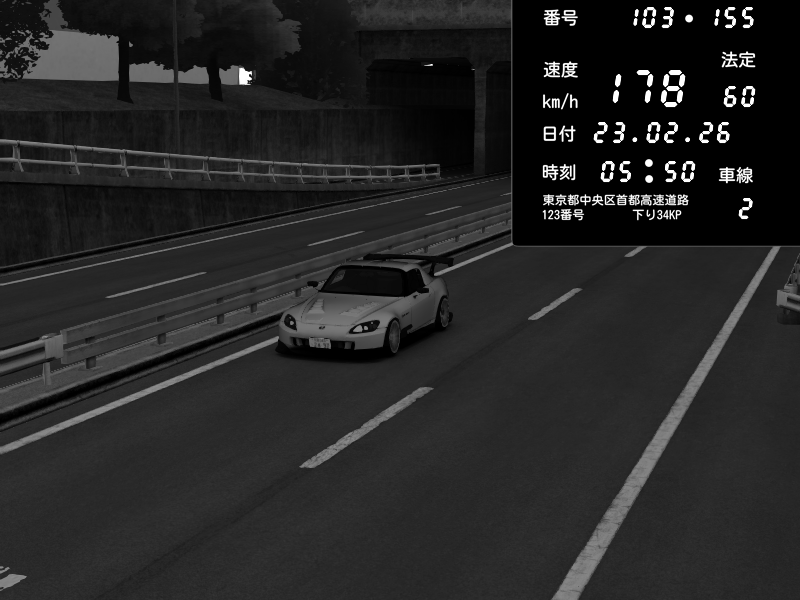 | 2026/02/23 05:50 | C1内回り 銀座 | 178 / 60 km/h | Sporkulon | Honda S2000 (AP2 - Legendary) | CAPTURE |
