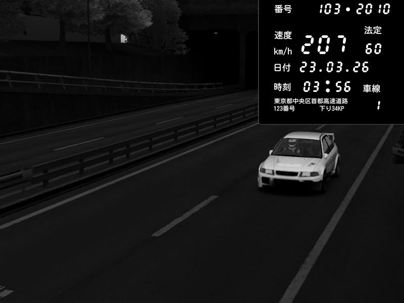 | 2026/03/22 22:59 | C1内回り 銀座 | 161 / 60 km/h | Nordschleife | Mitsubishi Lancer Evolution V Wangan Spec | CAPTURE |