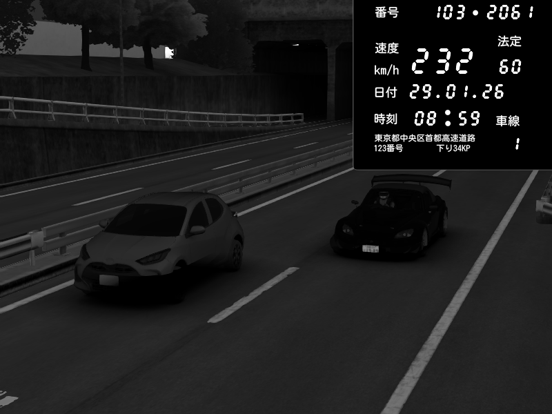 | 2026/01/28 20:20 | C1内回り 銀座 | 209 / 60 km/h | G29(LUT)&32TV60Hz3画面老人飲酒中 | Honda S2000 Turbo GT1 Amuse (AP1) | CAPTURE |