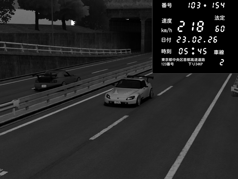 | 2026/02/23 05:45 | C1内回り 銀座 | 218 / 60 km/h | Sporkulon | Honda S2000 (AP2 - Legendary) | CAPTURE |