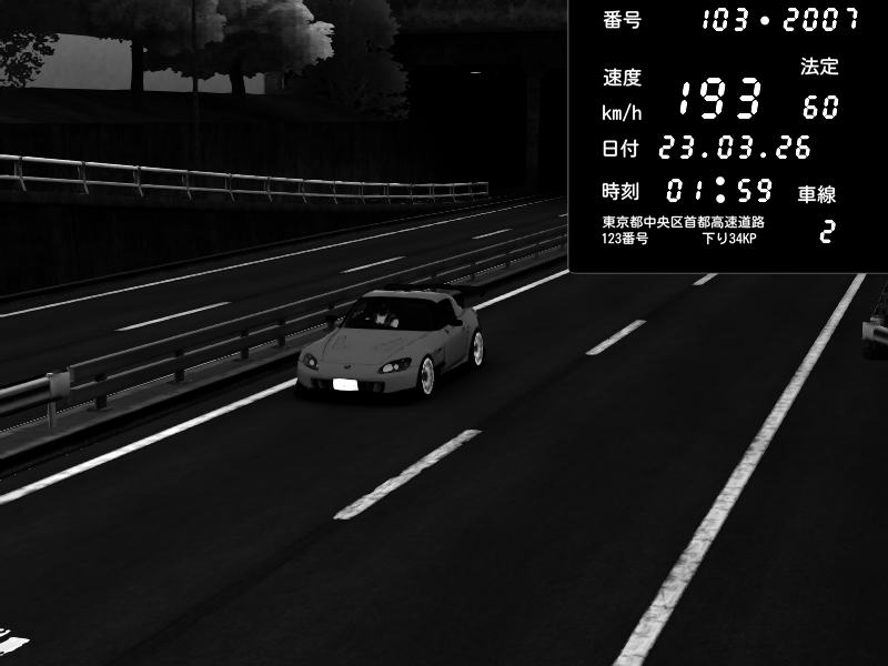 | 2026/03/23 01:59 | C1内回り 銀座 | 193 / 60 km/h | 木曜が一番疲れている | Honda S2000 (AP2 - Legendary) | CAPTURE |