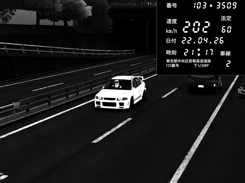 | 2026/04/21 00:46 | C1内回り 銀座 | 218 / 60 km/h | yuu gaku | Mitsubishi Lancer Evolution V Wangan Spec | CAPTURE |