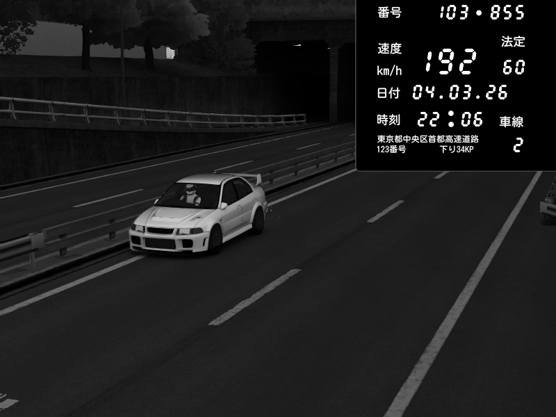 | 2026/03/04 22:00 | C1内回り 銀座 | 175 / 60 km/h | Eri Ieri | Mitsubishi Lancer Evolution V Wangan Spec | CAPTURE |