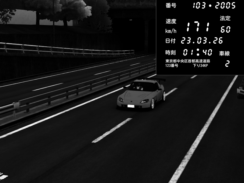 | 2026/03/23 01:40 | C1内回り 銀座 | 171 / 60 km/h | 木曜が一番疲れている | Honda S2000 (AP2 - Legendary) | CAPTURE |