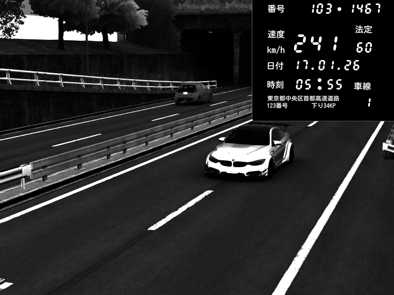 | 2026/01/17 05:55 | C1内回り 銀座 | 241 / 60 km/h | tsuki | BMW M4 crash.Sp Varis Widebody | CAPTURE |