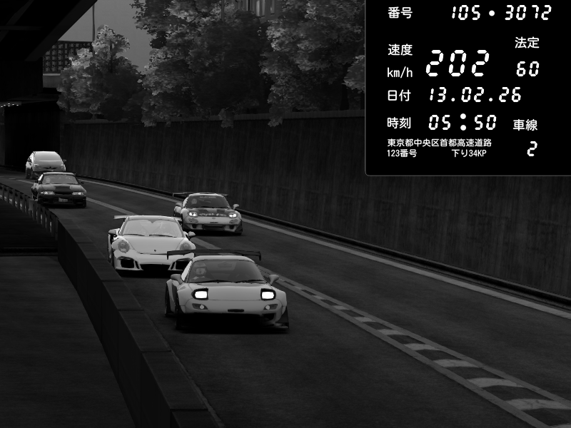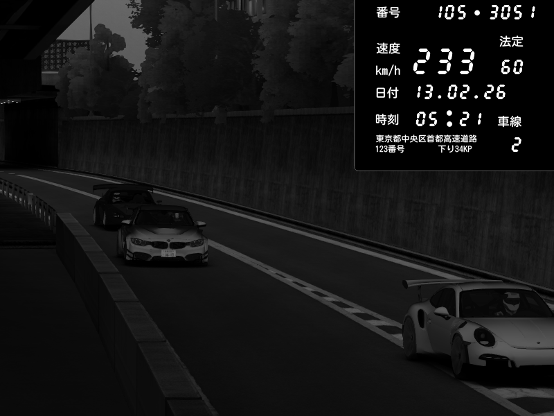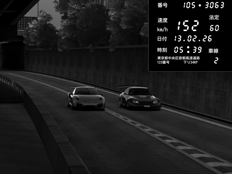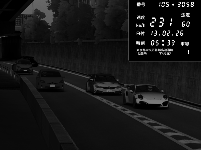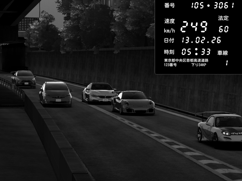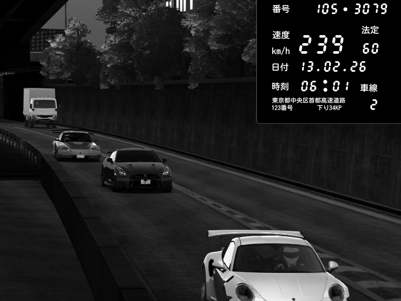 | 2026/02/14 02:31 | C1外回り 京橋 | 262 / 60 km/h | PrewoskIIx | Porsche 911 GT3 RS | CAPTURE |