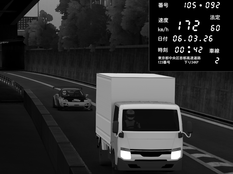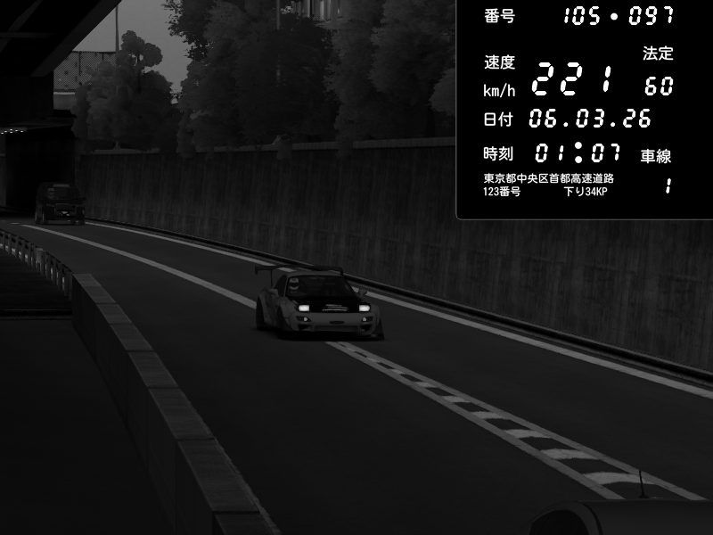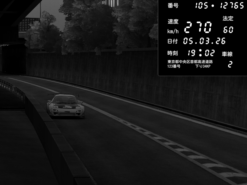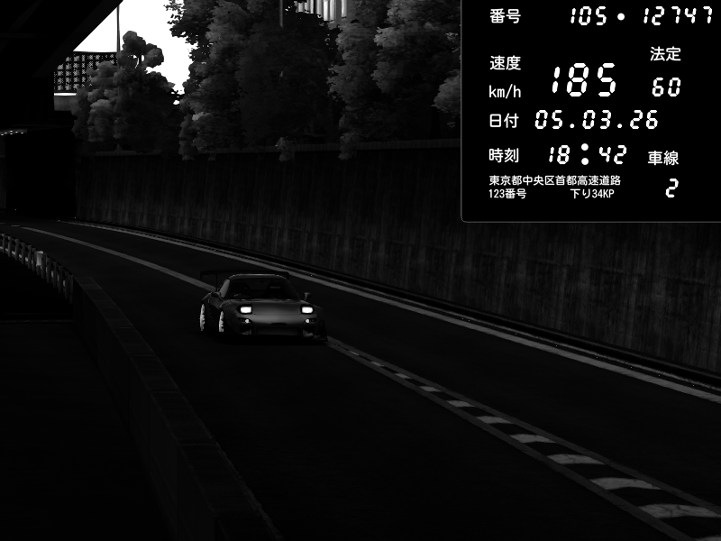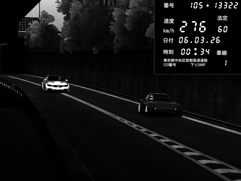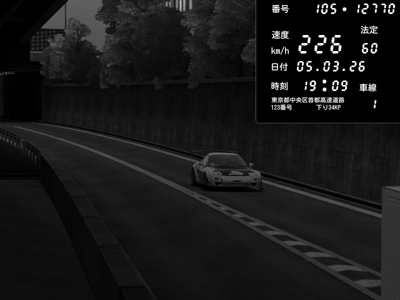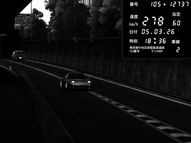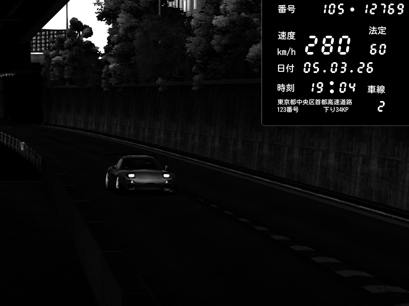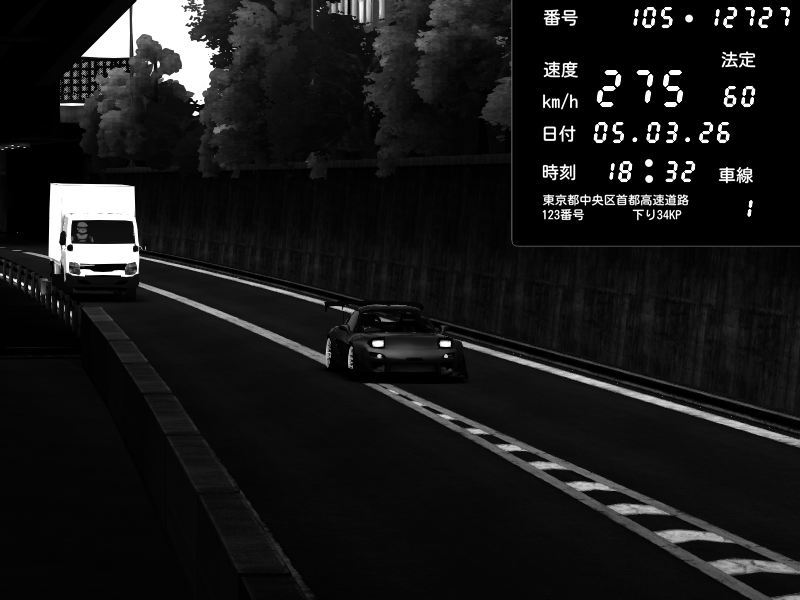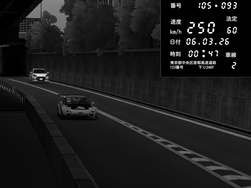 | 2026/03/06 00:34 | C1外回り 京橋 | 276 / 60 km/h | Player | Mazda RX-7 FD3S FEED Afflux GT3 | CAPTURE |
