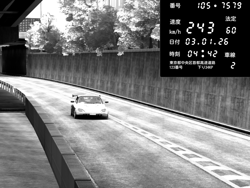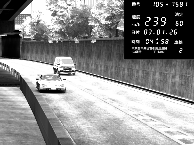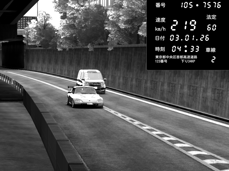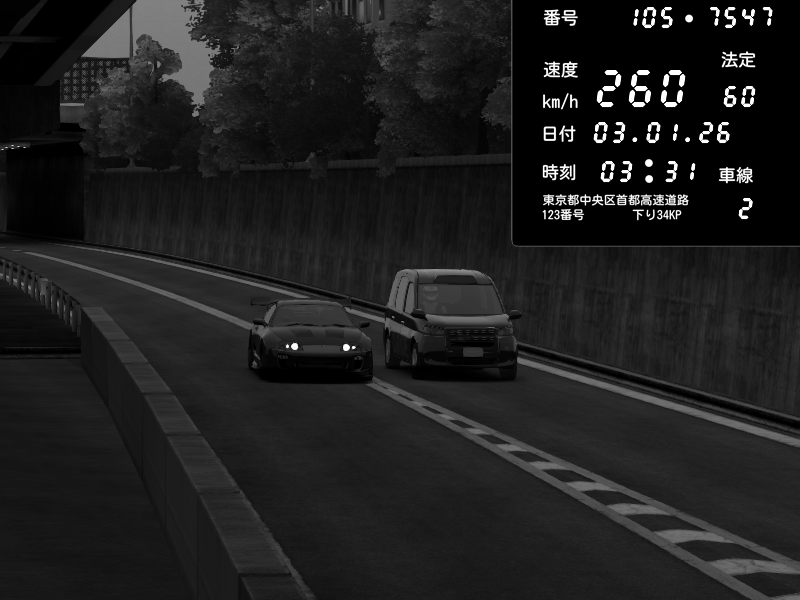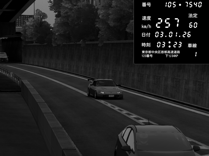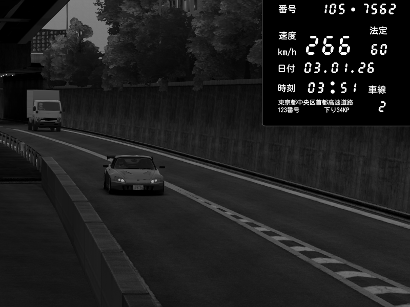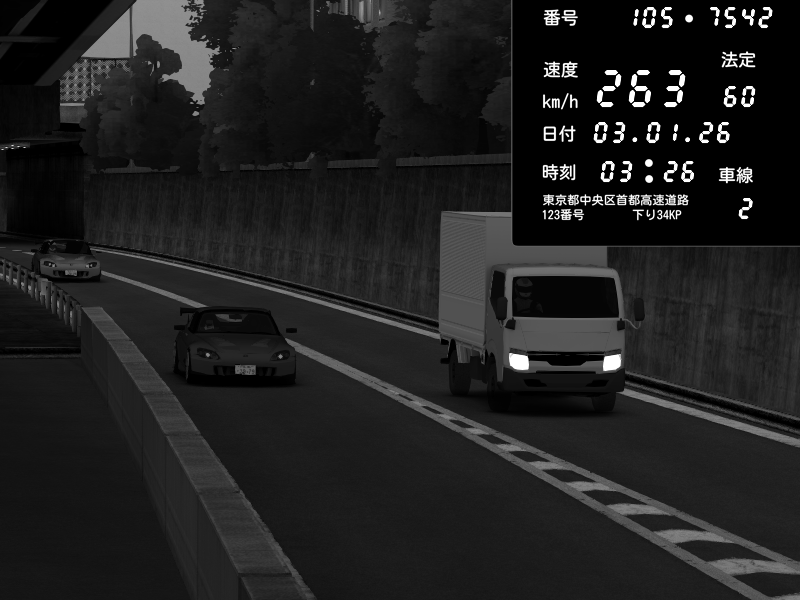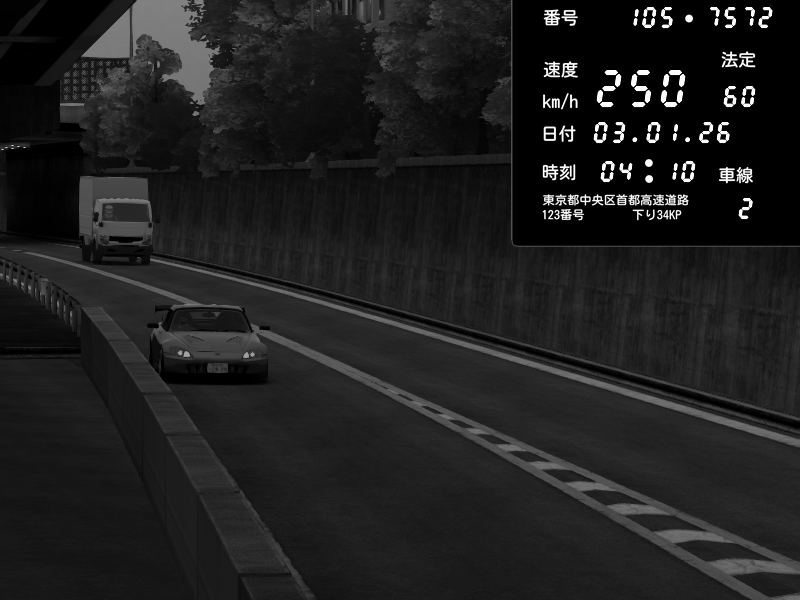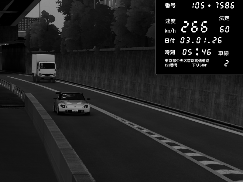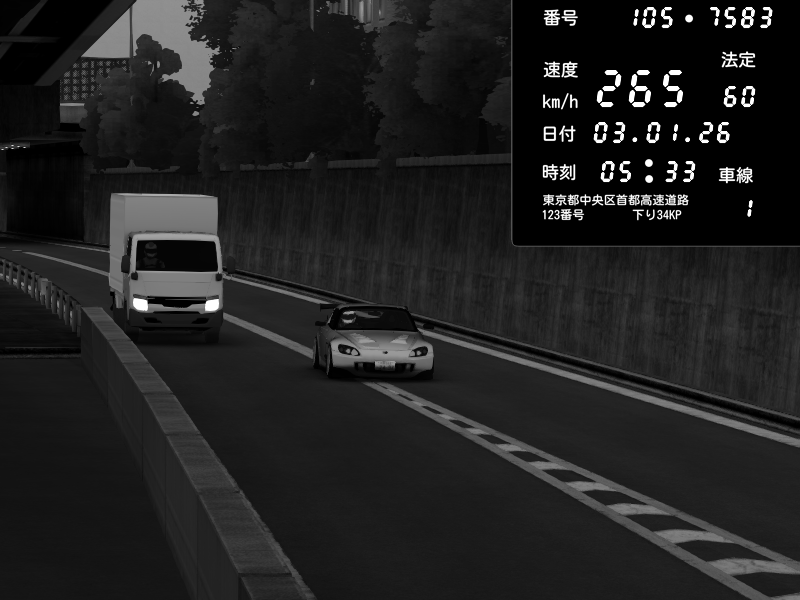 | 2026/01/03 05:33 | C1外回り 京橋 | 265 / 60 km/h | Desturno | Honda S2000 (AP2 - Legendary) | CAPTURE |