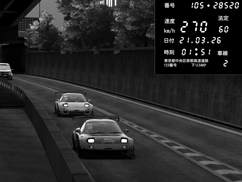 | 2026/03/21 01:51 | C1外回り 京橋 | 270 / 60 km/h | Futas | Mazda RX-7 FD3S FEED Afflux GT3 | CAPTURE |