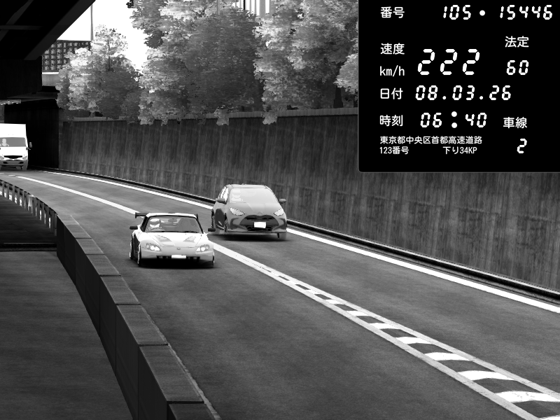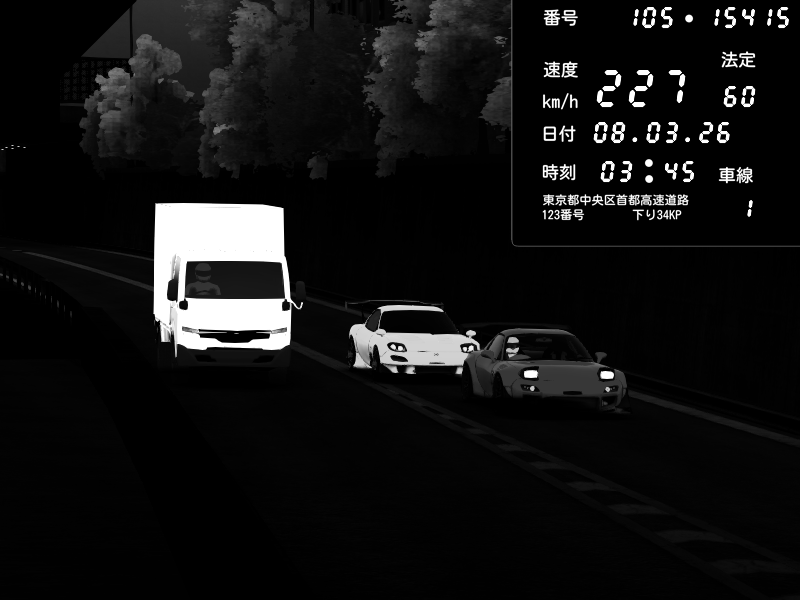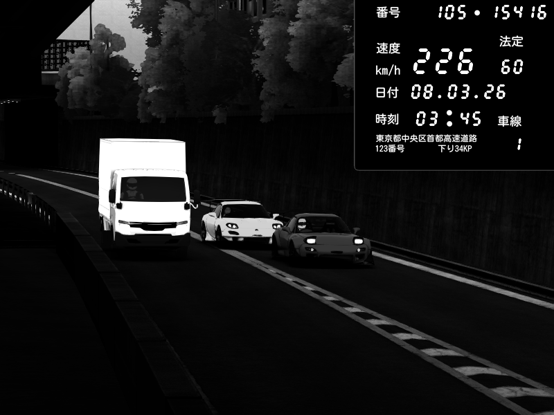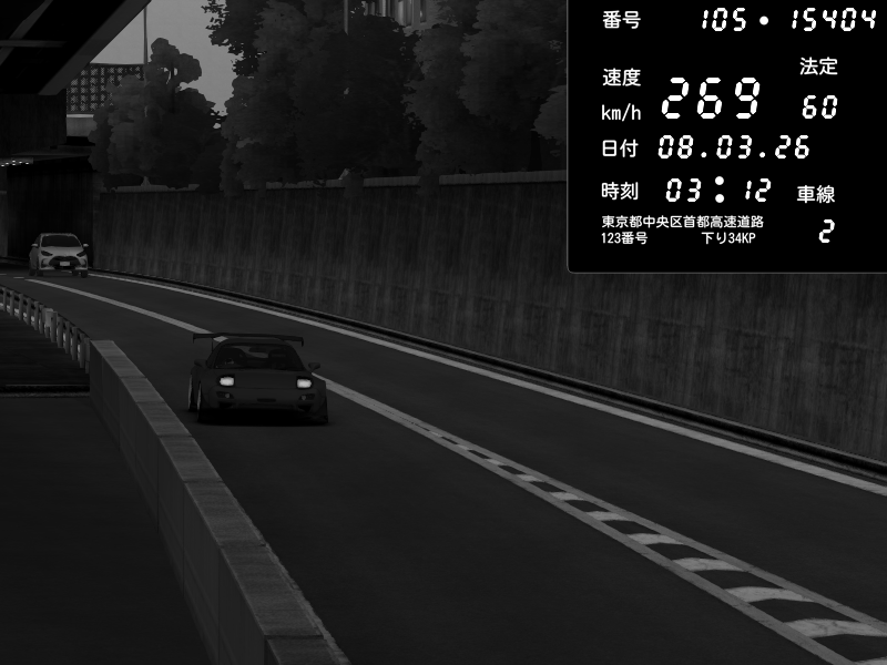 | 2026/03/08 03:45 | C1外回り 京橋 | 226 / 60 km/h | Player | Mazda RX-7 FD3S FEED Afflux GT3 | CAPTURE |