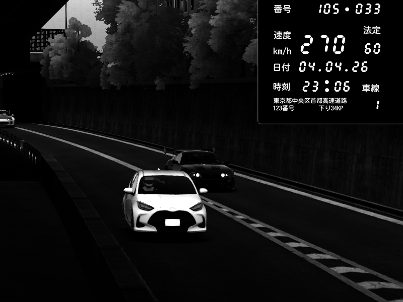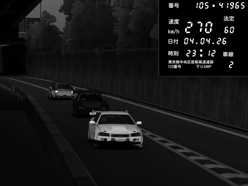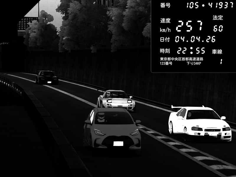| 2026/04/04 16:09 | C1外回り 京橋 | 259 / 60 km/h | Kurokabe/S.R.C | Nissan Skyline GT-R R34 Nismo Omori Factory S1 | CAPTURE |