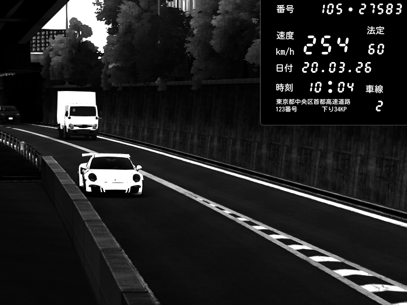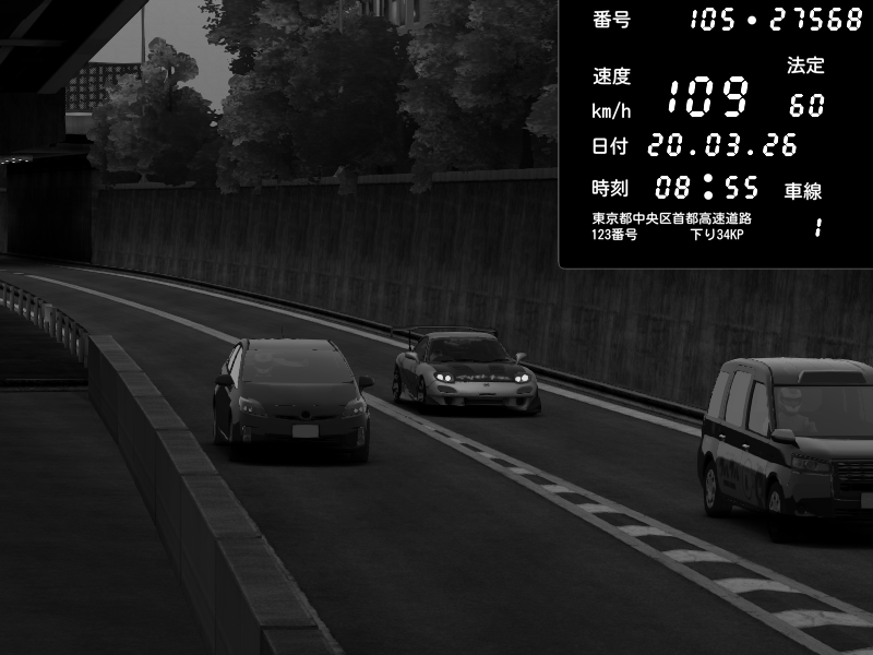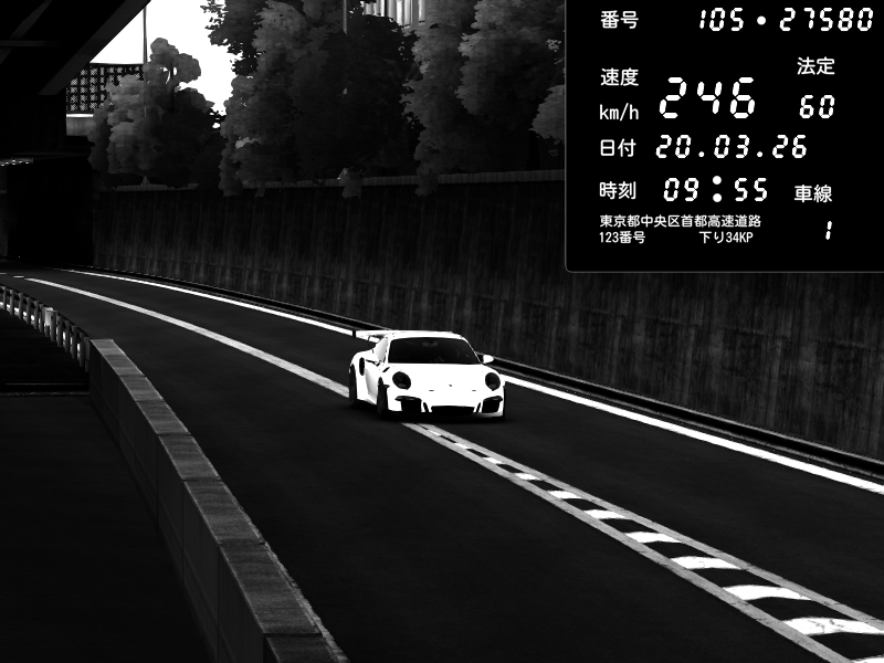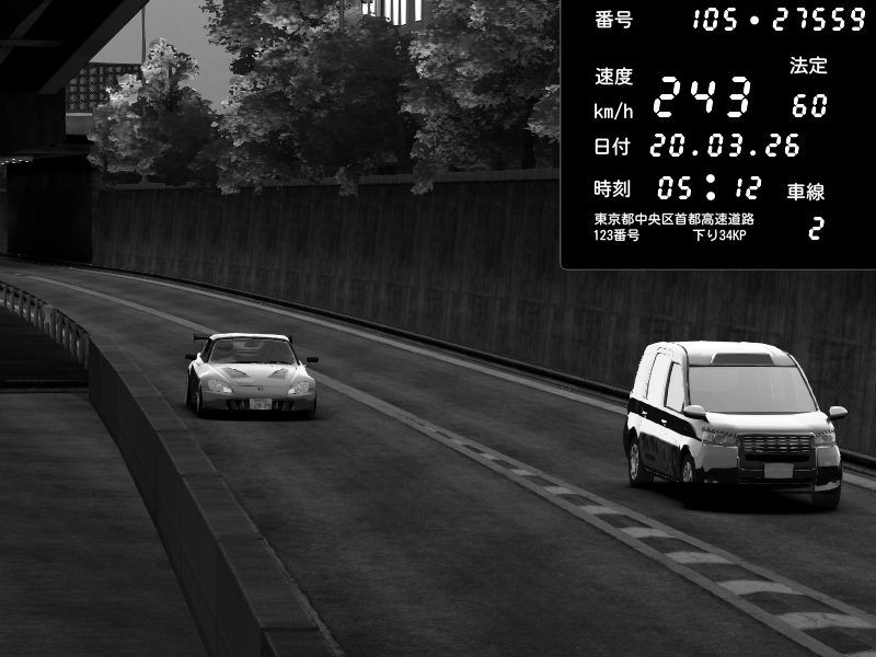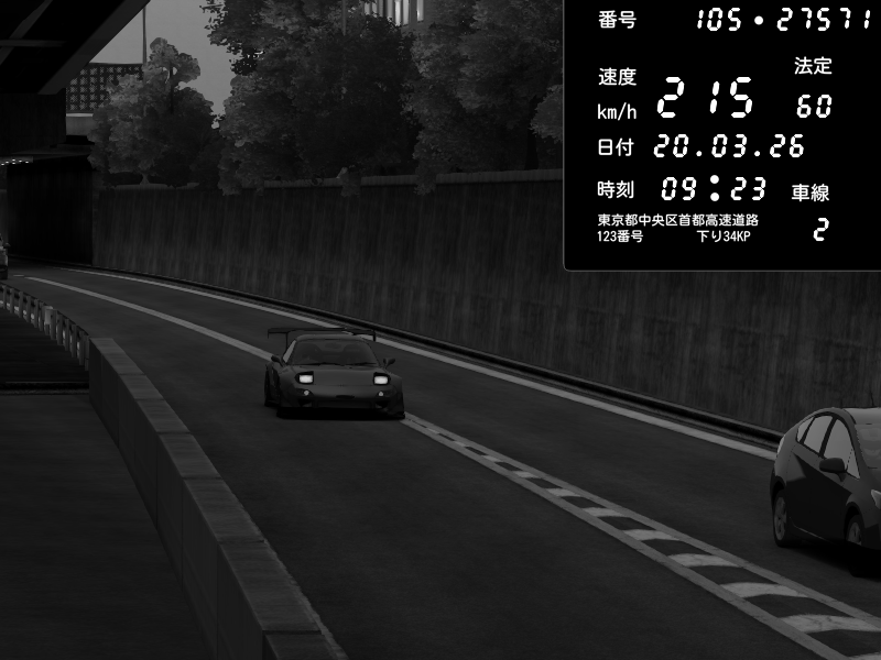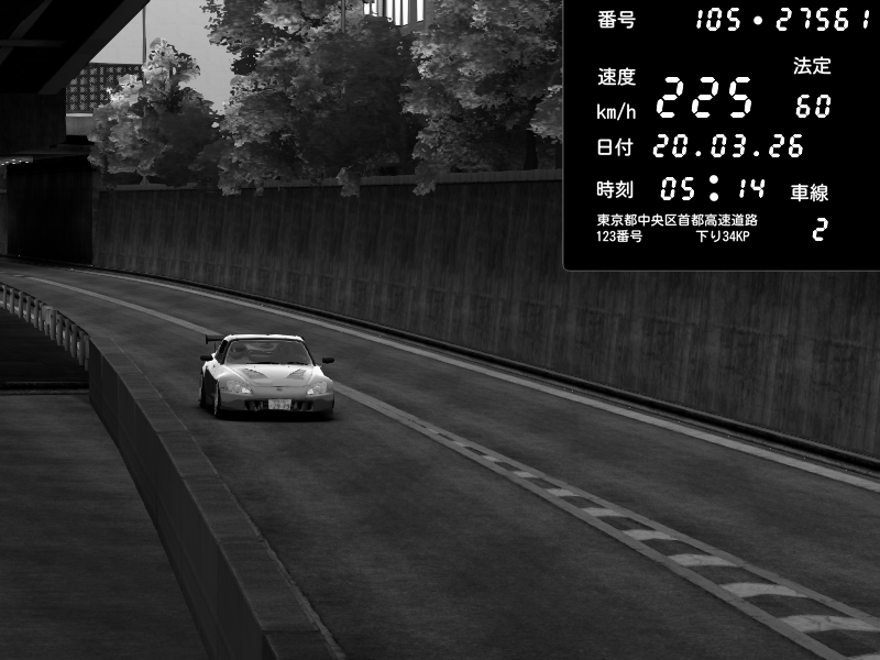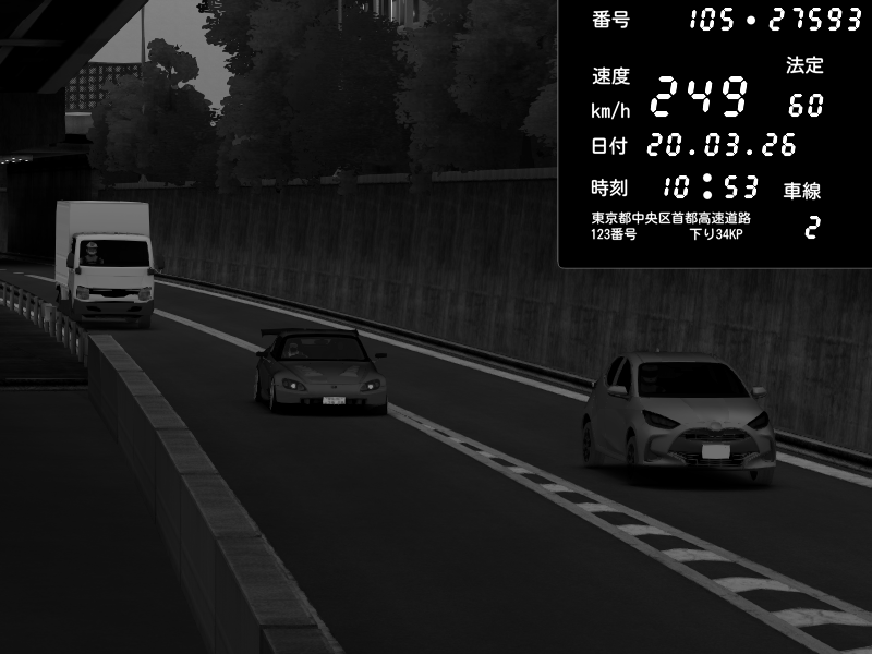 | 2026/03/21 01:53 | C1外回り 京橋 | 280 / 60 km/h | SHOW5 | Honda S2000 Turbo GT1 Amuse (AP1) | CAPTURE |
