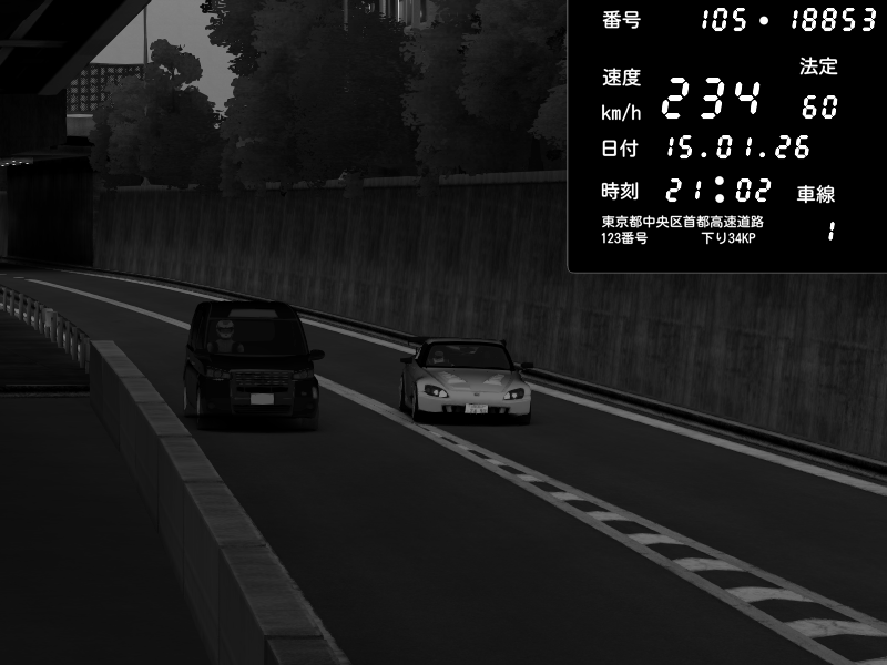 | 2026/01/15 21:02 | C1外回り 京橋 | 234 / 60 km/h | 黒日本人 | Honda S2000 (AP2 - Legendary) | CAPTURE |