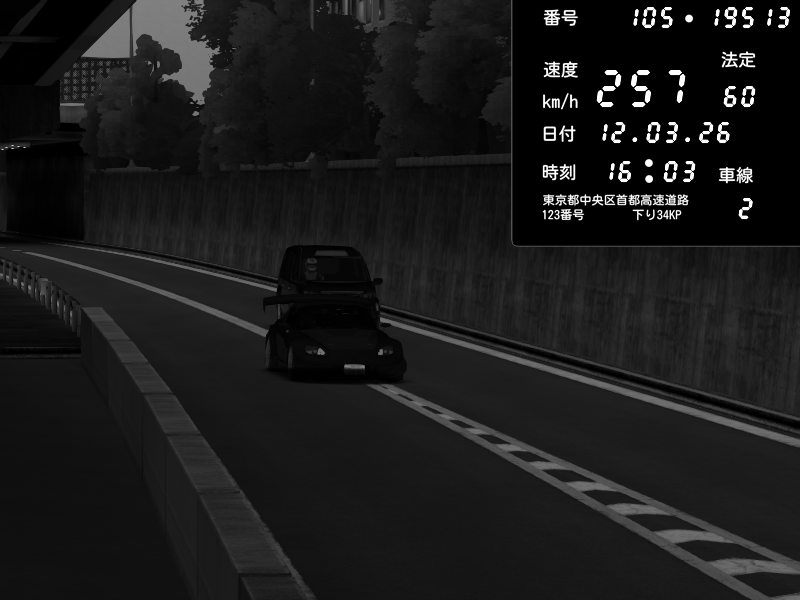 | 2026/03/12 16:03 | C1外回り 京橋 | 257 / 60 km/h | munyu0122 | Honda S2000 Turbo GT1 Amuse (AP1) | CAPTURE |