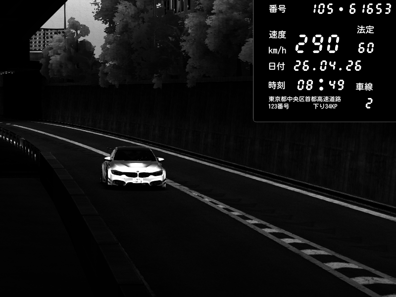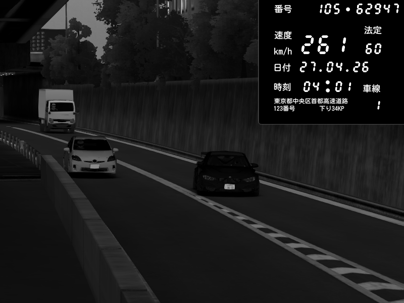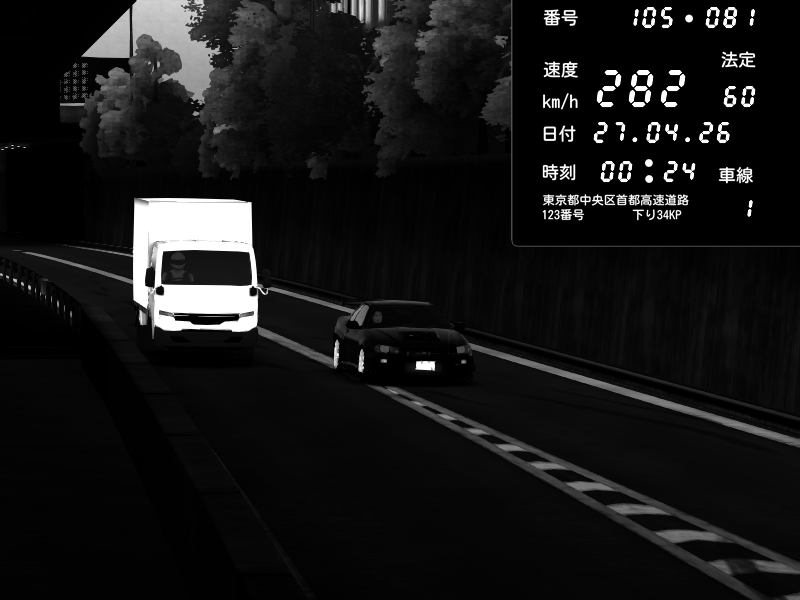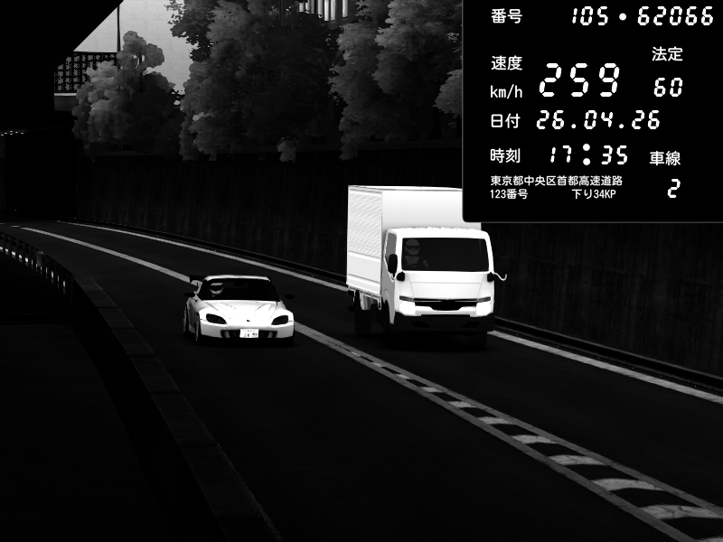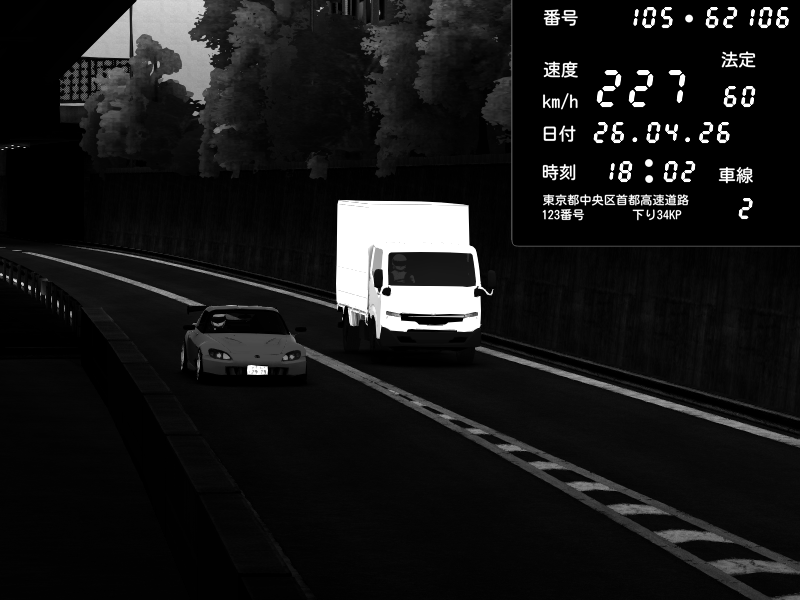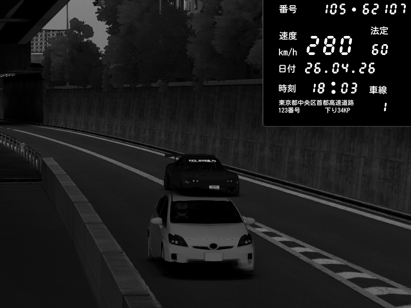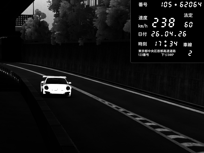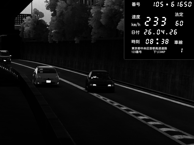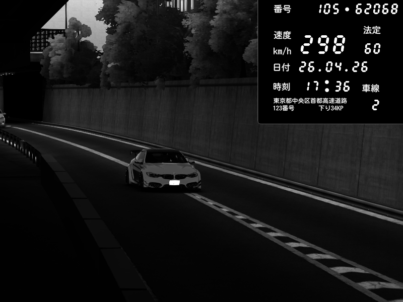 | 2026/04/26 08:38 | C1外回り 京橋 | 233 / 60 km/h | Player | Mitsubishi Lancer Evolution V Wangan Spec | CAPTURE |