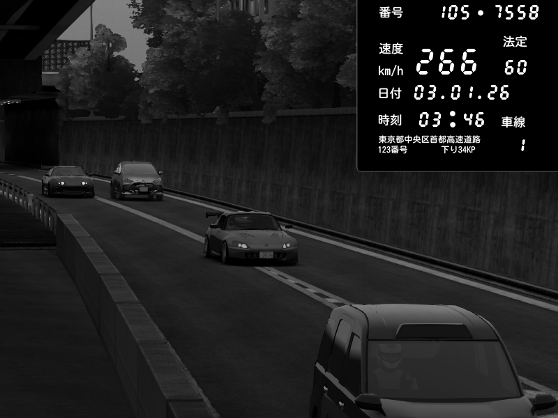 | 2026/01/03 03:46 | C1外回り 京橋 | 266 / 60 km/h | シマワークス | Honda S2000 (AP2 - Legendary) | CAPTURE |